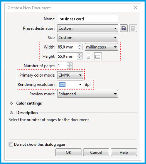 .In this window, define the name and dimensions of the document. Select the field and in enter .