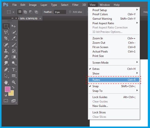 2.1 .Aumente el tamaño del Canvas , aplicando líneas guía en las extremidades del archivo. Si no tiene las guías visibles, vaya hasta View y elija Rulers.